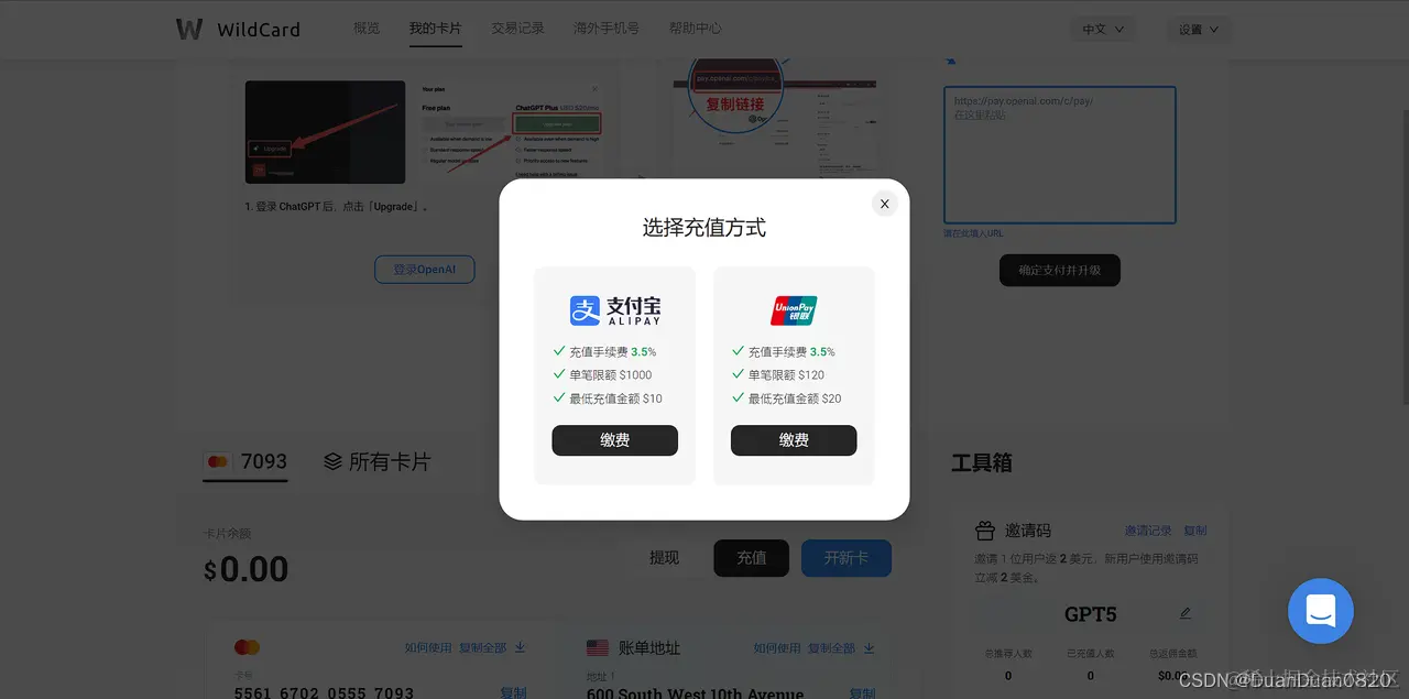 注册账号登录后先充值,可以使用支付宝支付,GPT的充值费用为20刀,但是会让充值20.7刀(3.5%手续费),多充值也可以再提现出来。