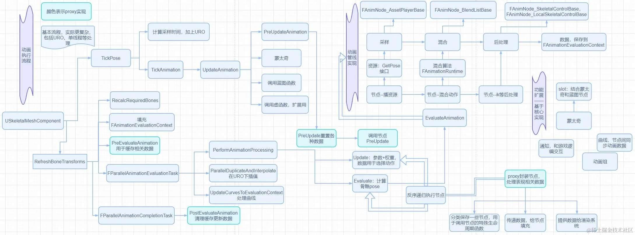 以上这些,就是动画最核心的实现了,是个层层封装的结构,节点实现动画管线,蓝图管理节点,组件驱动动画系统运行。流程上一些细节,看看代码都好理解。