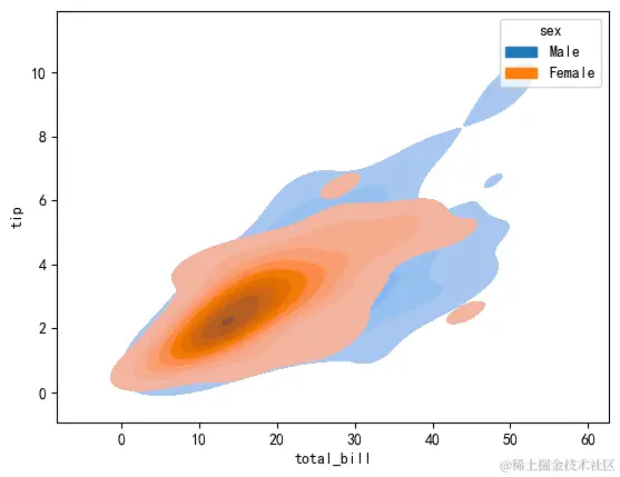 sns.kdeplot(data=tips, x="total_bill",y="tip",hue="sex",fill=True)