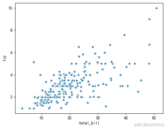 sns.scatterplot(data=tips, x="total_bill", y="tip",s=100, marker="*") # 五角星