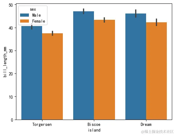 1、如果hue参数是分类型,每个组是不同的颜色: