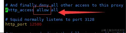 http_access deny all 这表示允许和拒绝 deny为拒绝所有人访问 这里改为 allow