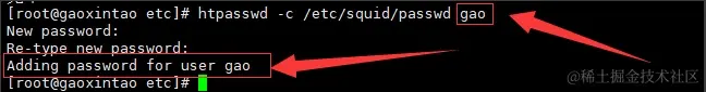 生成用户和密码,htpasswd -c /etc/squid/passwd gao gao为用户名 再输入2次密码 即可成功