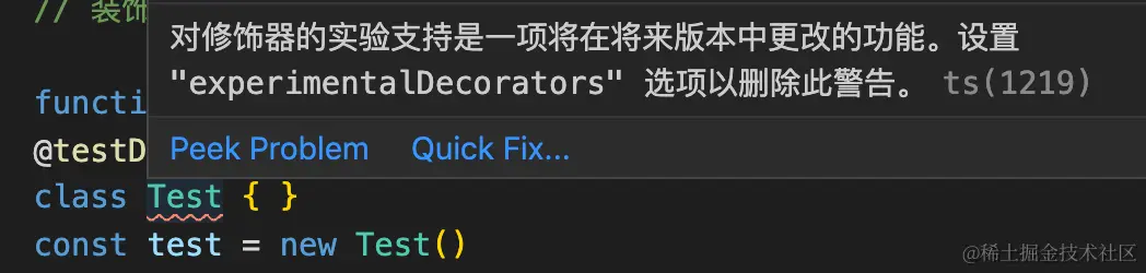 function testDecorator(constructor: any) { console.log('decorator') } @testDecorator class Test { } // 装饰器定义类的时候就会立即执行装饰器函数,对类进行装饰 const test = new Test() // new实例化的时候并不会执行装饰器函数