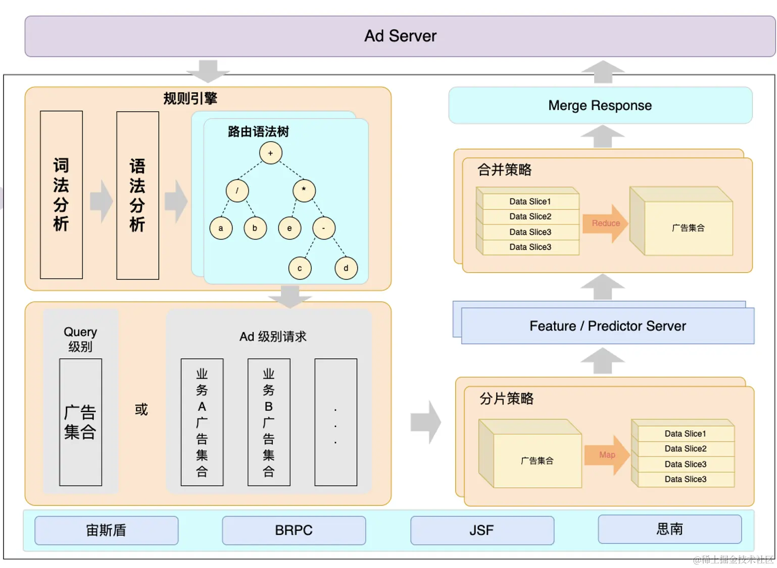 ◦流量路由:流量路由的核心是进行动态流量识别,根据配置动态构建语法树,将流量映射到语法树中,从而做到识别流量全路径,包括流量从哪里来、到哪里去。当有新的流量进入或着加入新的模型,可在语法树中添加或修改叶节点,实现动态路由。同时在分层实验中,使用语法树,也可实现流量分层,增加小流量试验的并发度,提升流量使用效率。