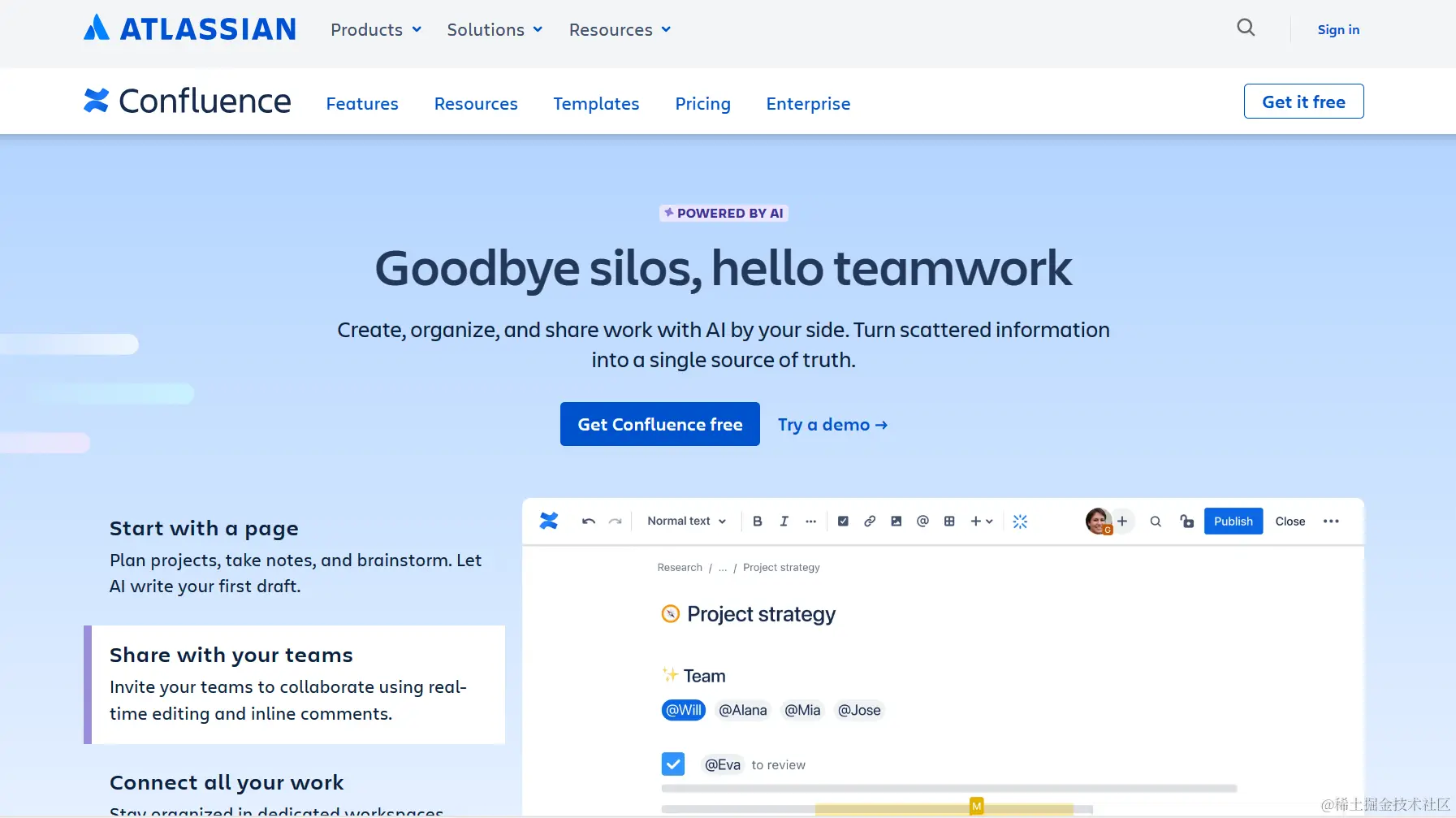 Confluence是一个专业的企业知识管理与协同软件,也是一个wiki,旨在帮助团队成员之间实现高效协作和知识共享。它由Atlassian公司推出,非商业用途可以免费使用。