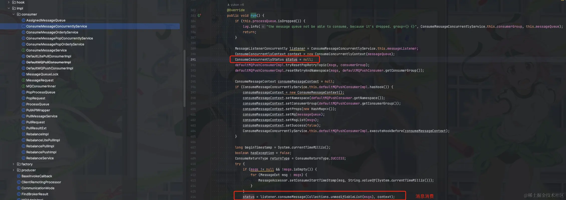 具体的逻辑是org.apache.rocketmq.client.impl.consumer.ConsumeMessageConcurrentlyService.ConsumeRequest#run