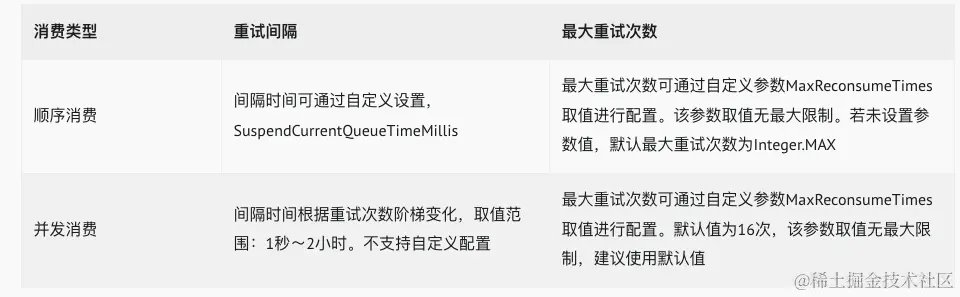 普通消息重试默认是16次,顺序消息默认是Integer.MAX_VALUE,消息消费失败会以延时消息的方式投递到broker,超过延时消息的最大值则以2小时为重试间隔。现在提供了不同的重试策略,默认是CustomizedRetryPolicy