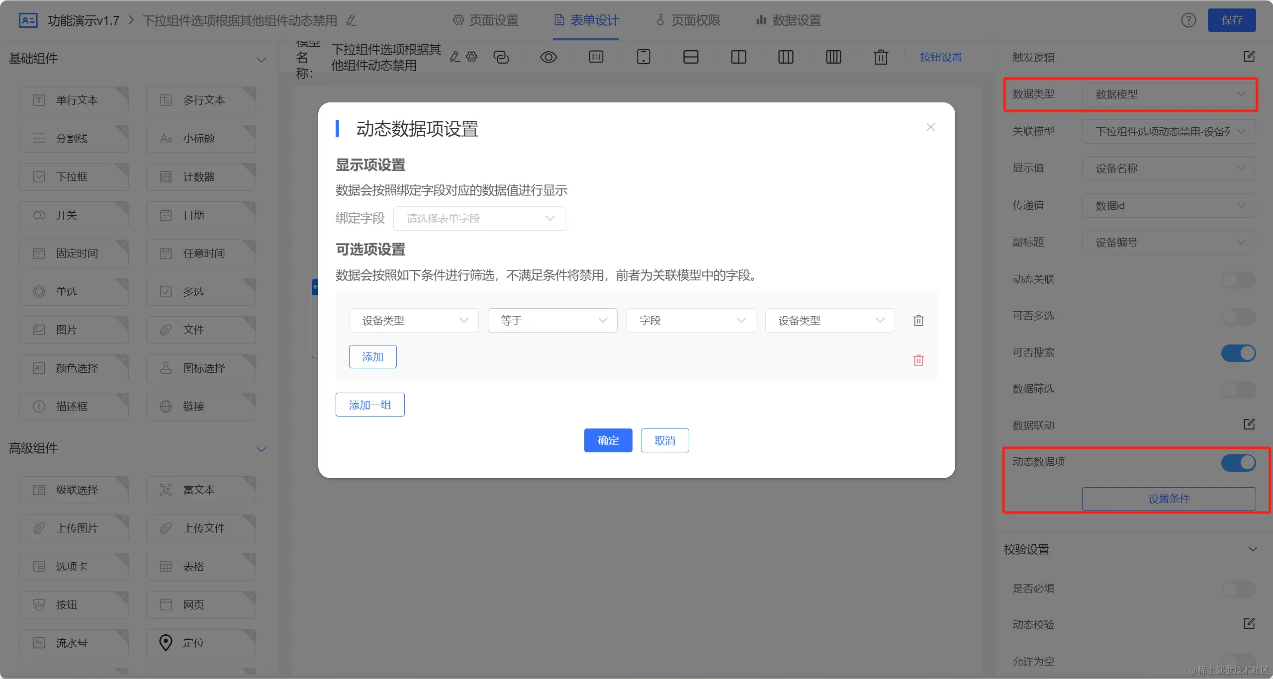 下拉框选项数据来源是模型数据时我们可以通过可选项设置配置动态禁用显示。