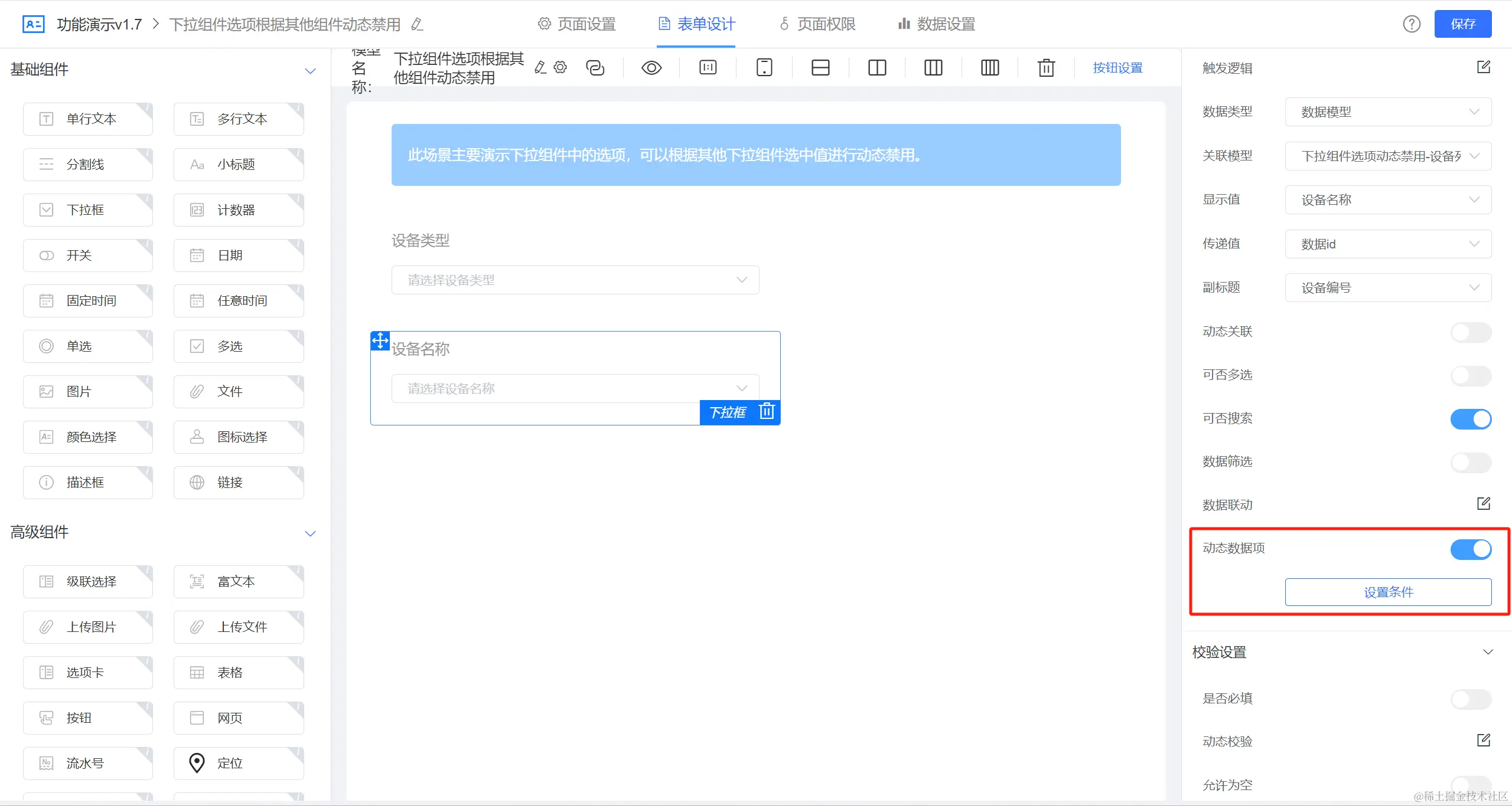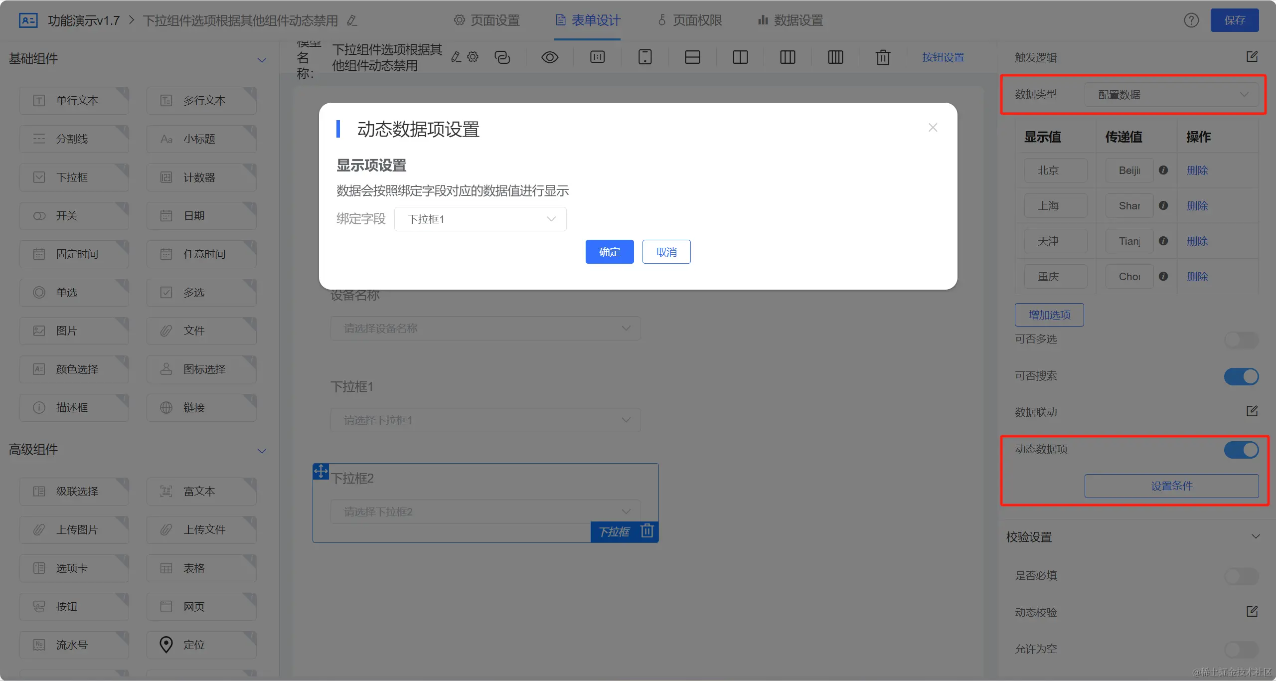 进入表单设计器,选择两个下拉框组件,需要哪一个下拉框选项动态显示就对哪一个下拉框进行配置。点击【设置条件】进行动态数据项设置。