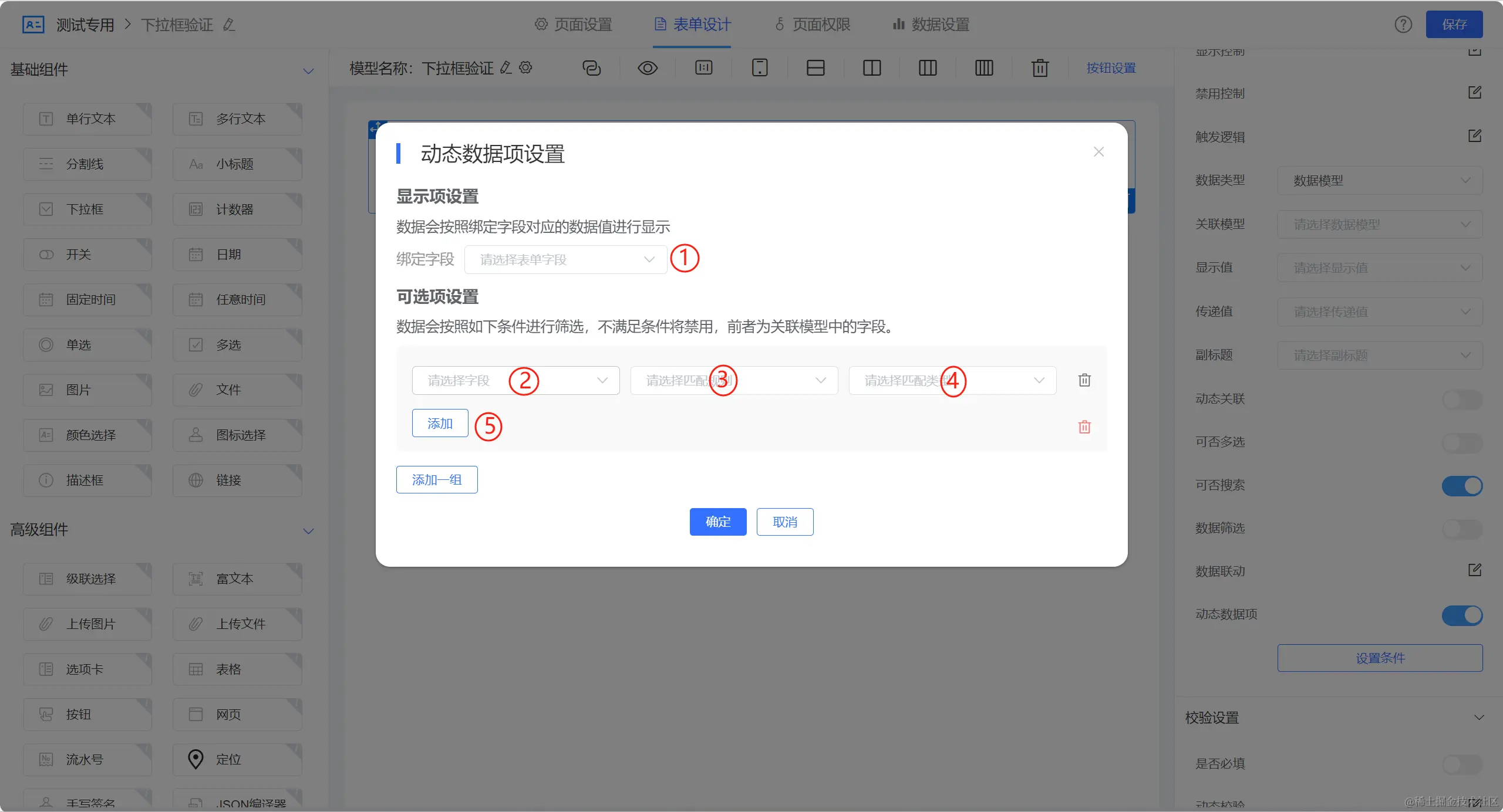 ④:匹配类型,可选字段和自定义,字段选择来自当前下拉框组件对应字段。
