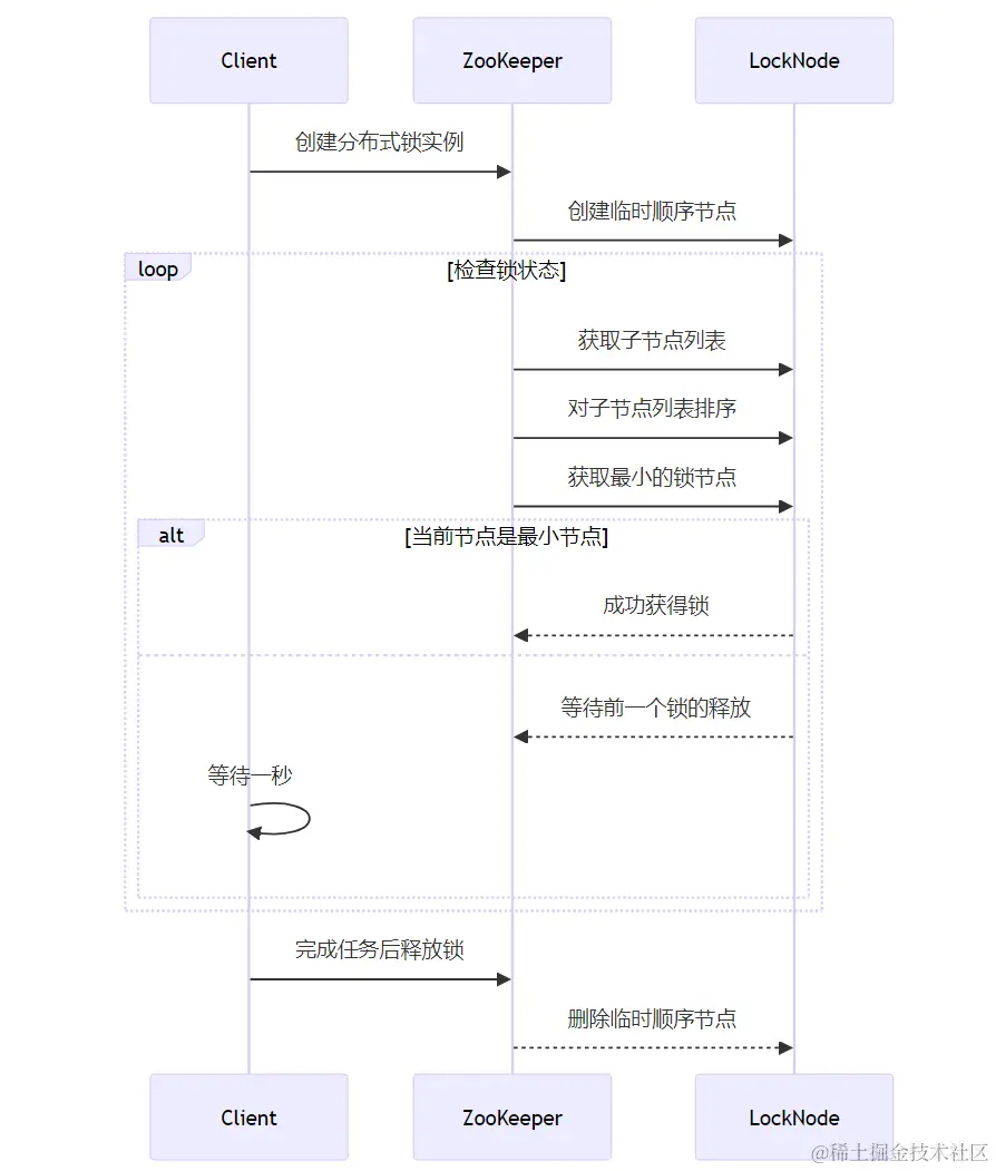 获取锁的过程就是比较序号的过程。每个进程会检查自己创建的节点是否是当前路径下序号最小的节点。如果是,那么恭喜,获取锁成功,可以访问共享资源了。如果不是,就等待序号比自己小的节点释放锁。