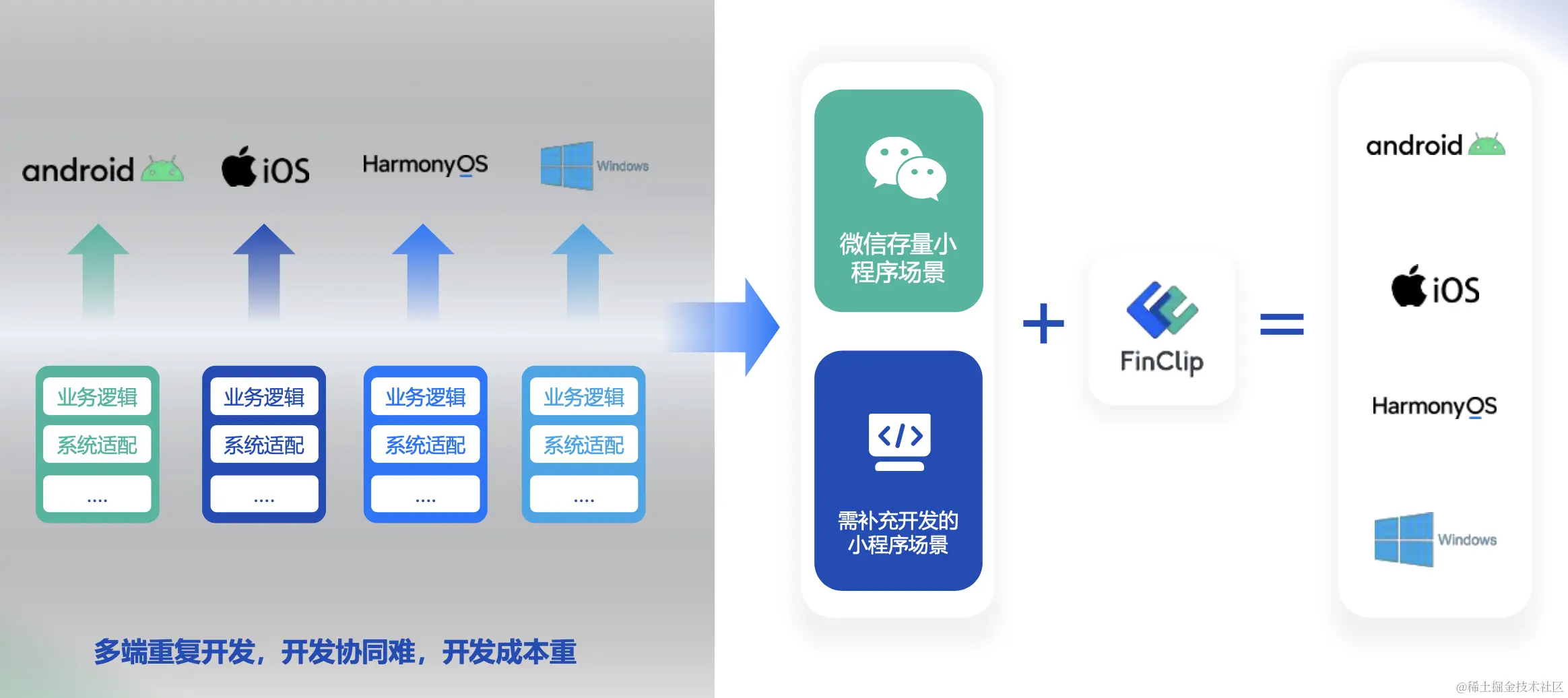 但是,Apple、Android、HarmonyOS的技术生态,都无比庞大,其中的技术体系非常复杂,使用门槛非常高。而很多企业IT及其开发商,受限于自身技术能力的局限,不自觉的把自己的业务应用的技术实现,深度绑定、依赖到某个技术体系中。支持多个技术体系,就要重复建设。当需要通过支持来自多个技术渠道、多种技术生态下的客户时,发现明明是同一个业务内容,就是在不同的技术设备载体上体验不一致、功能不对齐、成熟度参差。