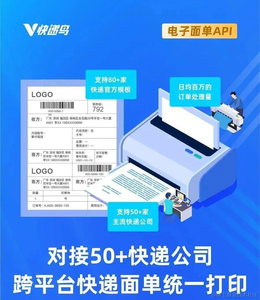 快递鸟电子面单API作为市面上成熟稳定、安全有保障的第三方API, 不断迭代升级,拉通了三通一达、顺丰、德邦、极兔等50多家主流快递物流公司,并通过提供80+标准面单模板、毫秒级单号获取、运单号自动绑定订单号、用户隐私加【*】保护、一对一客服专属服务,帮助电商平台、品牌商家、云仓等客户实现多平台快速批量打单,提升发货效率。