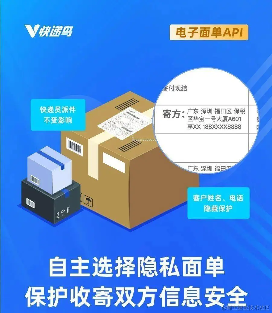在保护信息安全上,快递鸟电子面单API支持合作客户自主选择隐私面单,对收寄双发的个人信息进行脱敏,保障寄收双方的个人信息安全。在不影响快递员派件的同时,后台完整记录收寄件人的明细信息,每一个运单都可追溯可查询,方便企业进行内部管理以及部门成本核算。