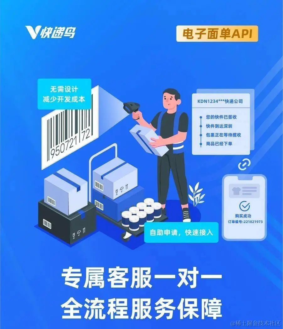 快递鸟电子面单提供标准化API接口,可自助申请,支持2小时内快速嵌入企业系统。使用快递鸟电子面单API,无需人工录入单号,平均0.3秒即可获取快递单号,支持单号、面单、分拣码自动返回,运单号自动绑定订单号,方便电商追踪物流及后续收货及售后等流程。