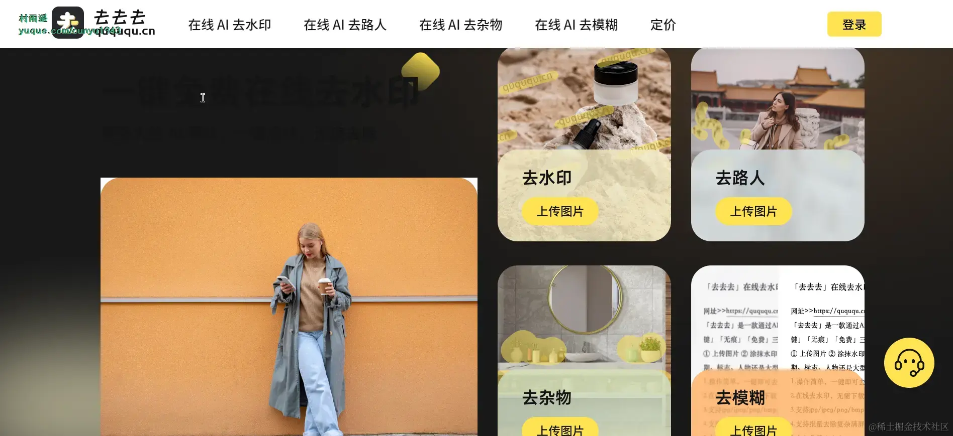 一款图片在线去水印网站,永久免费,使用人工智能技术,支持批量去除图片中的文字、标志,多余物体等多种水印,去水印不留痕,不压画质,高质不糊图!