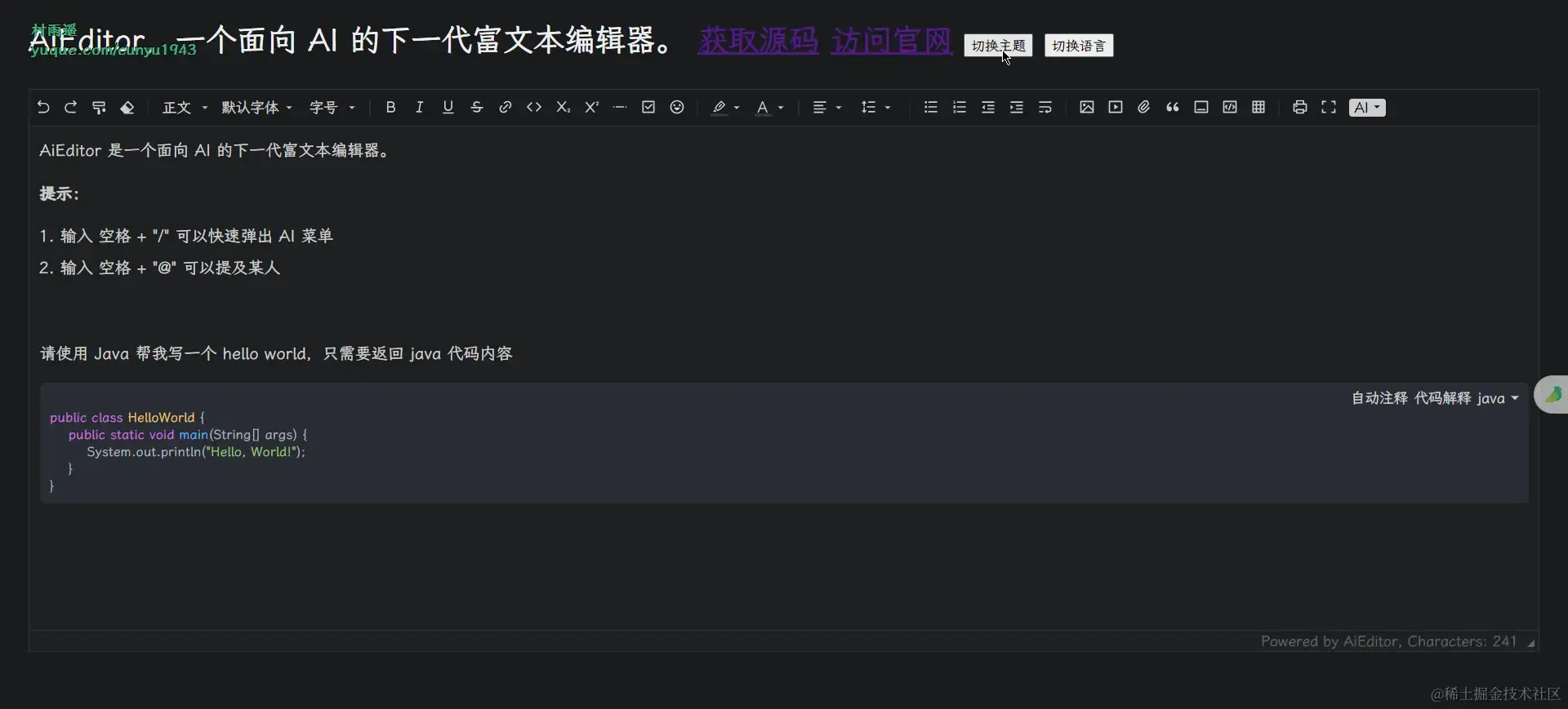 一个面向 AI 的下一代富文本编辑器,她基于 Web Component,因此支持 Layui、Vue、React、Angular 等几乎任何前端框架。她适配了 PC Web 端和手机端,并提供了亮色和暗色两个主题。除此之外,还提供了灵活的配置,开发者可以方便的使用其开发任何文字编辑的应用。