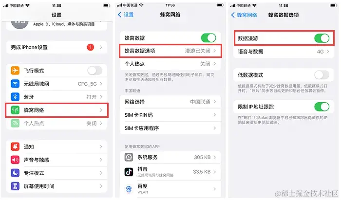 如果您正在国外旅行,请确保您的设备已设置为数据漫游。进入**【设置】>【蜂窝移动网络】>【蜂窝数据选项】中,确保【数据漫游】**选项被正确设置。