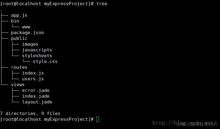 看见以上信息便说明我们的express项目已经创建完成了。我们看看工程目录下的myExpressProject目录下到底有些什么文件呢?