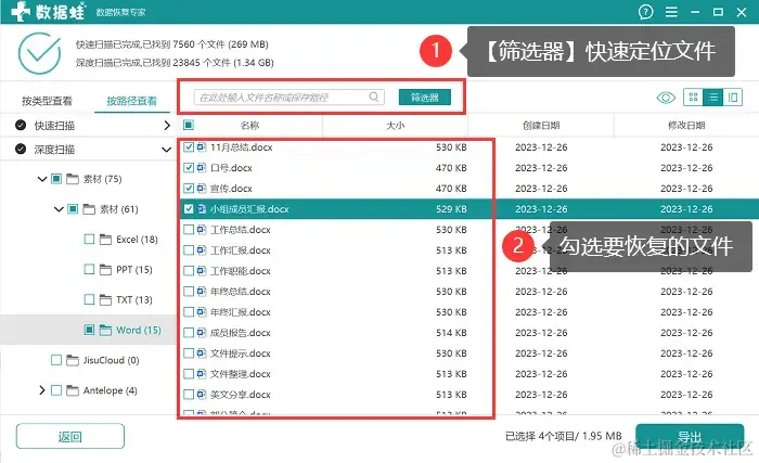 深度扫描完成后,软件会呈现较多的数据。可根据需求将需要恢复的文件都勾选上,如果文件比较多,建议在【筛选器】中对文件进行快速定位。