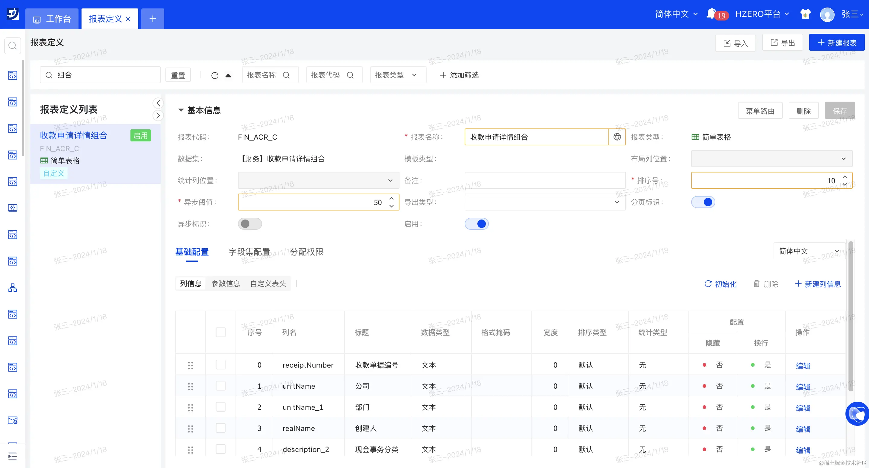 通过组合业务对象将收款申请头数据和行数据组合后,基于此组合业务对象创建数据集,然后根据业务对象字段创建元数据字段列,这样数据集就维护完成了。维护完成数据集之后再通过报表定义选择此数据集将数据进行展示,如此就完成了报表部分的配置。