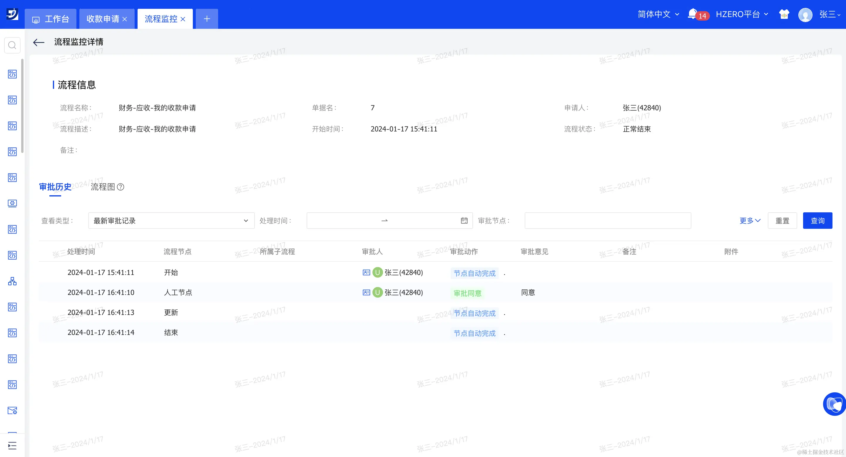 当用户提交申请单发起审批后,想要了解流程审批的进度和结果,可以通过配置 HZERO页面跳转节点实现。该节点预置了系统中的常用页面,其中预置的流程监控详情页面可以查看当前单据的审批情况。
