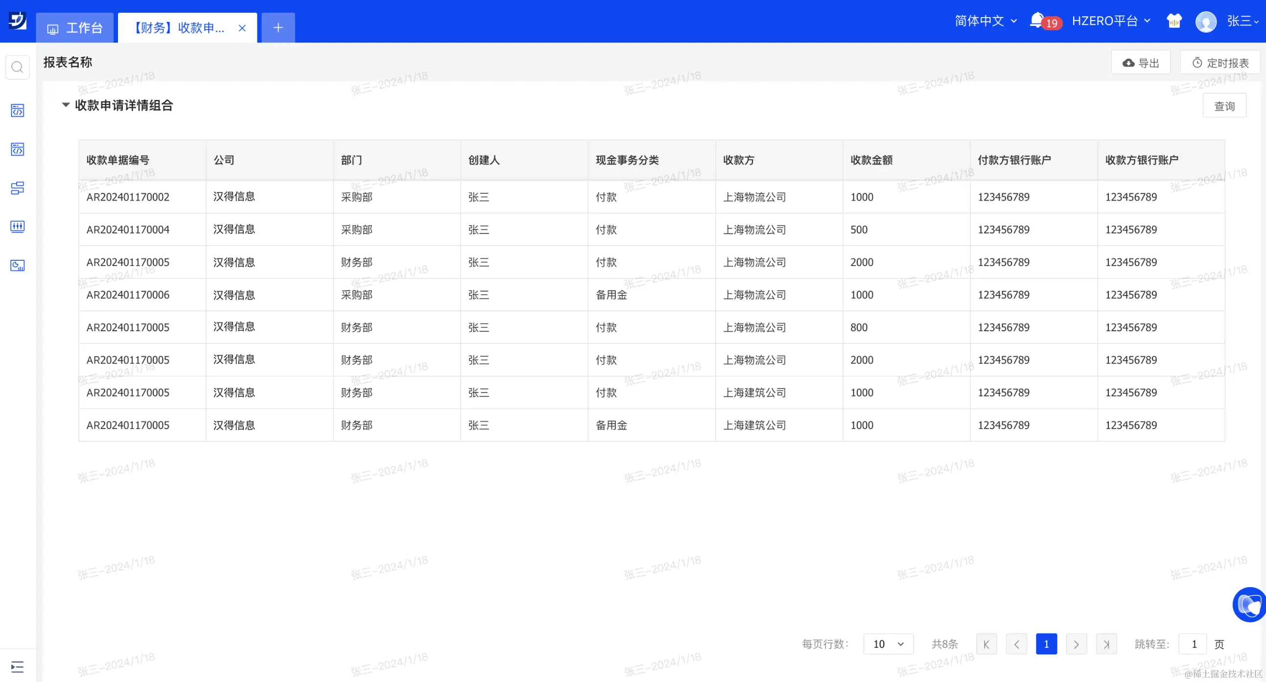 最后再通过飞搭事件流中的 HZERO报表节点使用此报表,就完成了报表相关的一系列配置。用户在页面点击报表按钮即可查看报表配置的收款申请单数据。