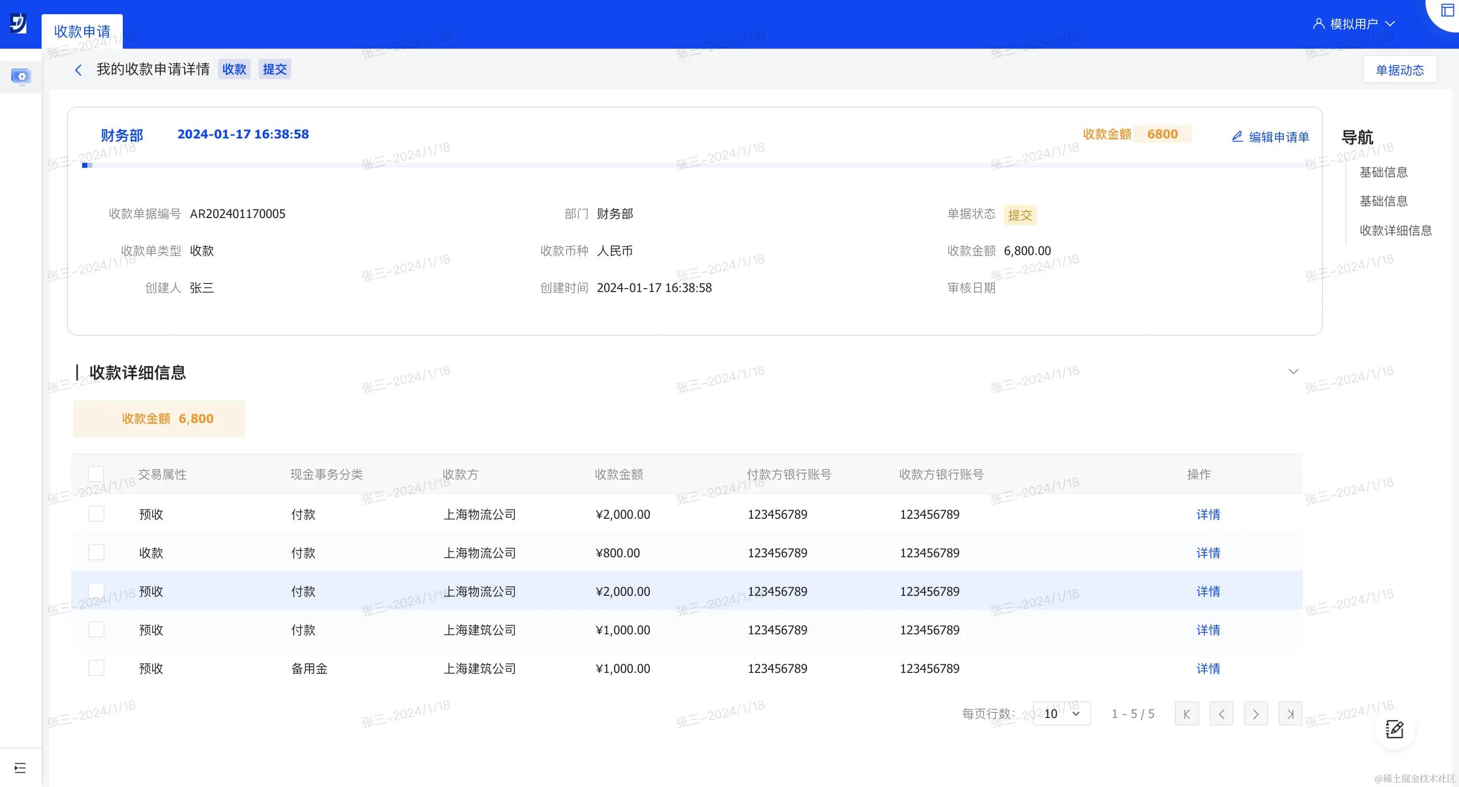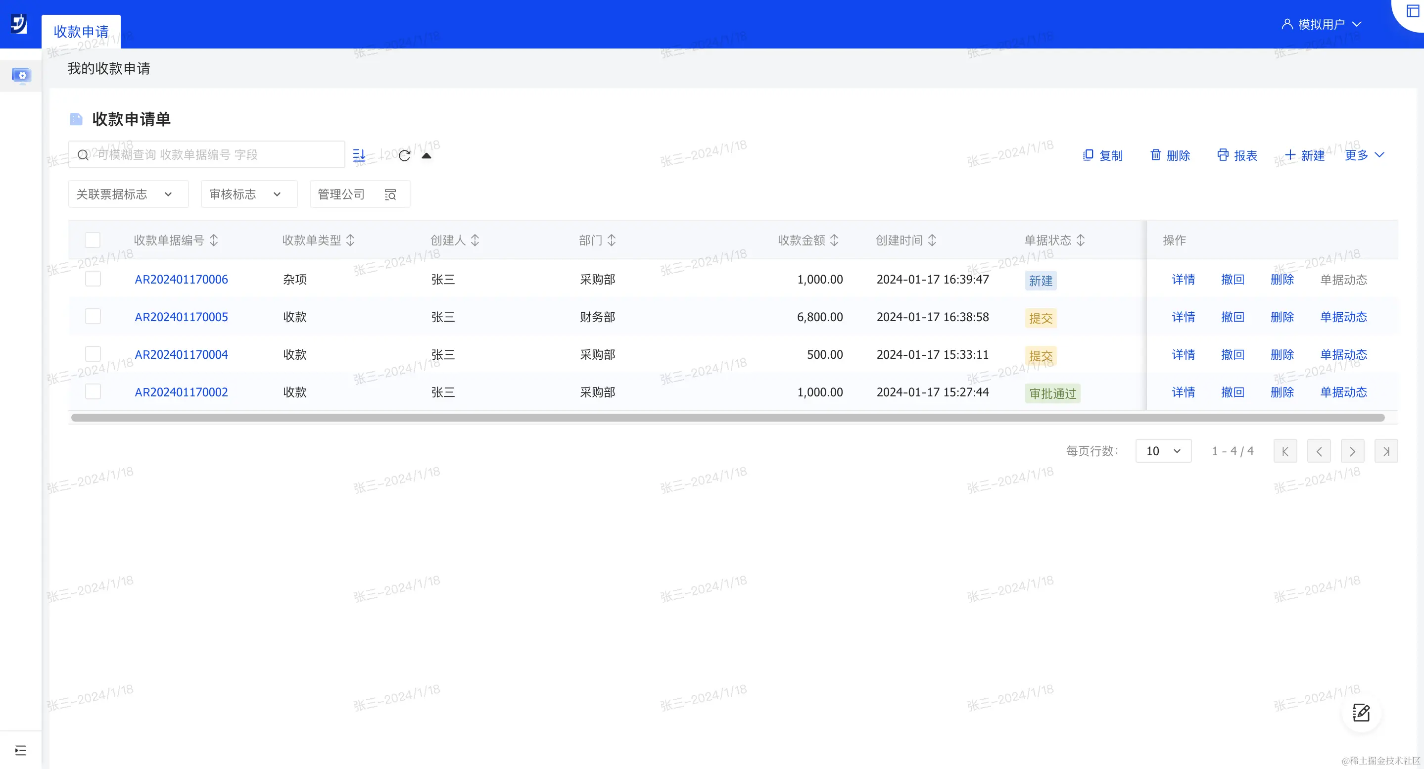 对于财务系统中的收款申请功能,此时的页面已经具备了收款申请单增、删、改、查的功能,每个收款单内也具备了对费用行信息增、删、改、查的功能。(如对模板配置感兴趣,可查看往期文章: 《只需三步,完成功能页面搭建》 )
