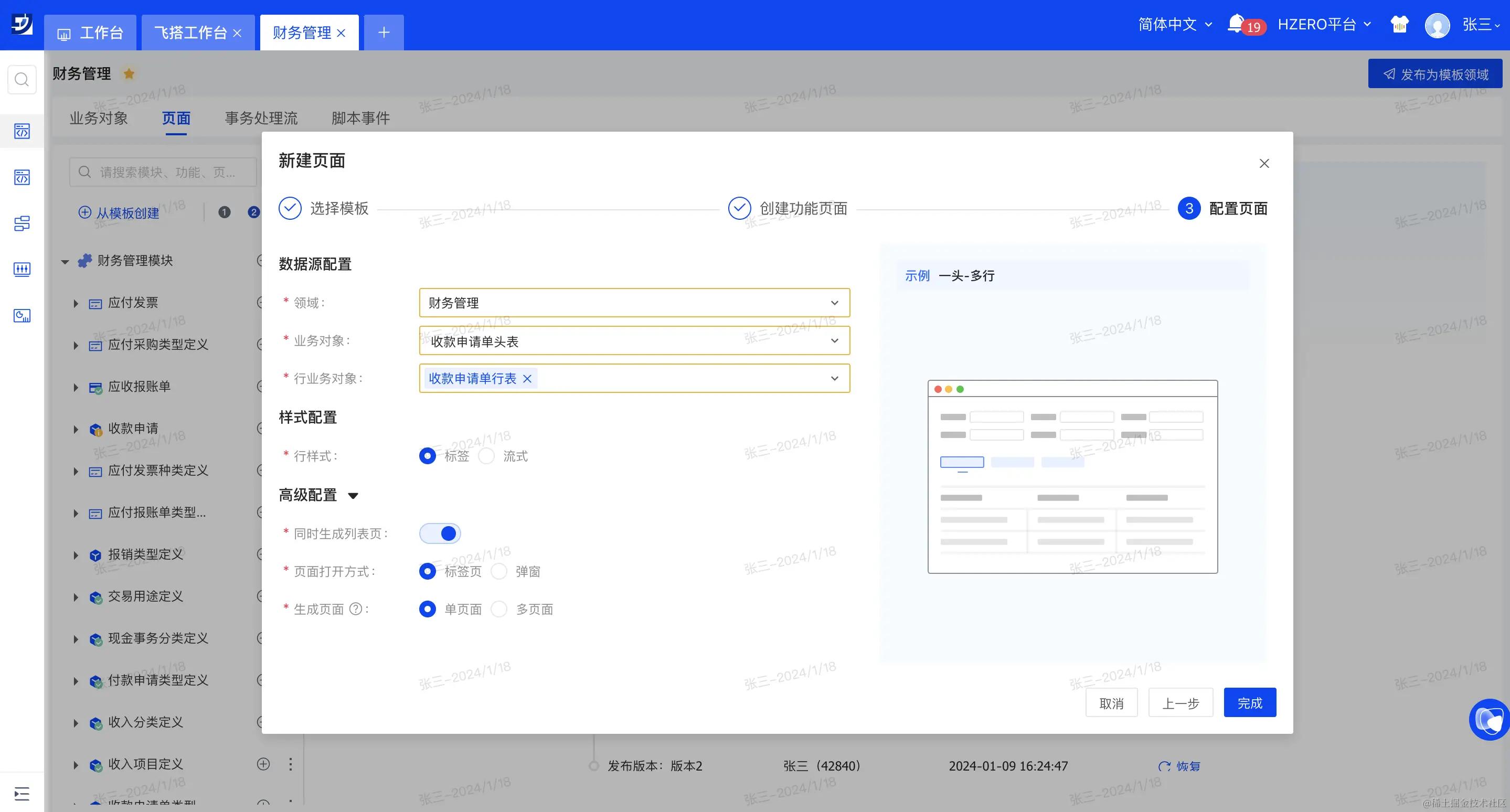 确认需求场景之后可以通过模板生成页面。通过一头多行模板,配置数据源、页面打开方式、生成页面效果等属性,配置完成后即可快速创建出列表和详情页面。借助飞搭的模板能力,只需要1分钟即可完成页面基础功能搭建。