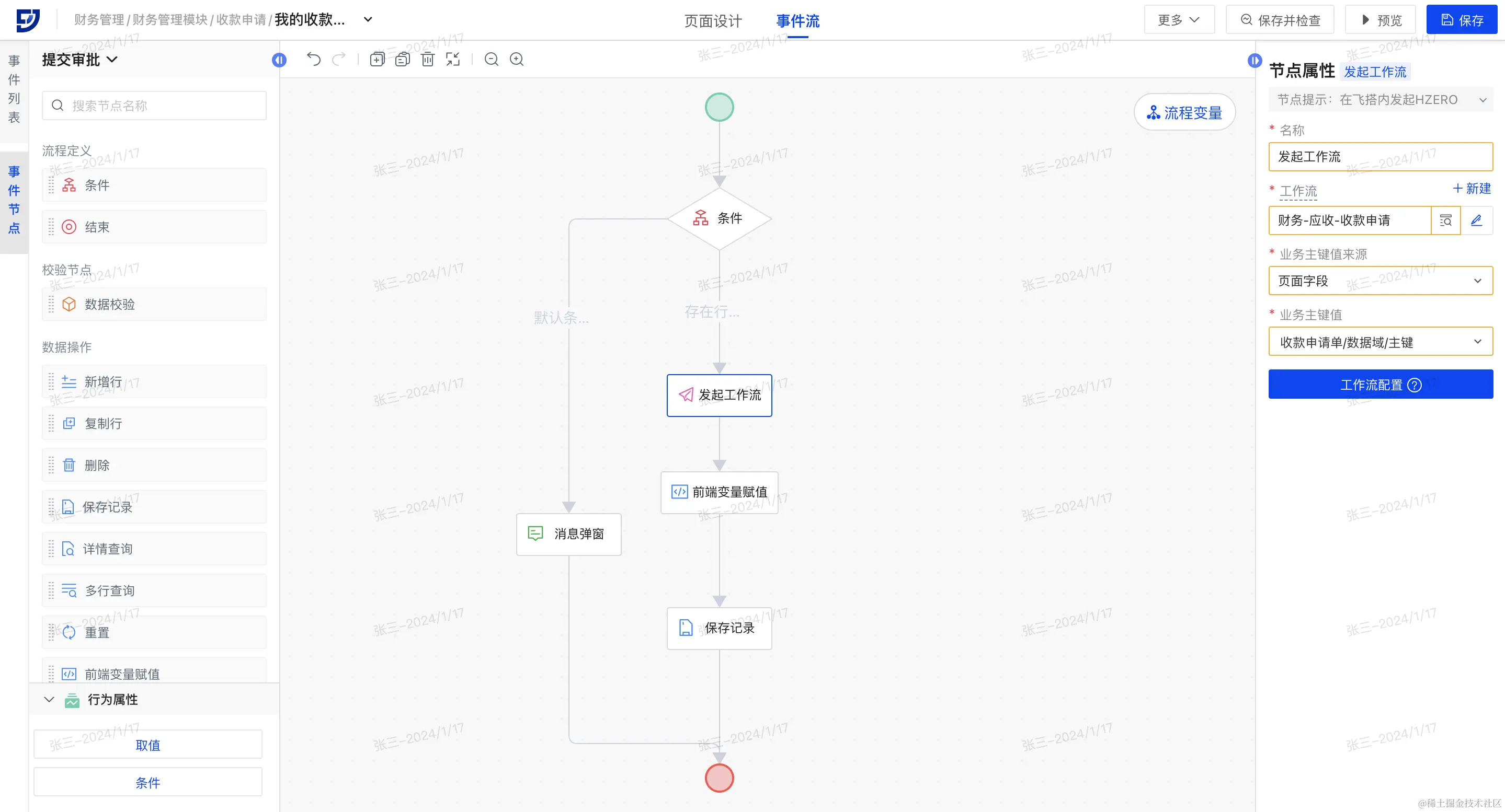 在飞搭事件流中应用发起工作流节点维护配置信息后,发起工作流的功能就维护完成了。(如对工作流的配置感兴趣,还可查看往期文章: 《 低代码与工作流审批:加速企业数字化进程》 **)