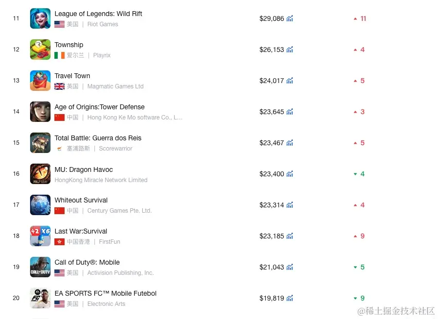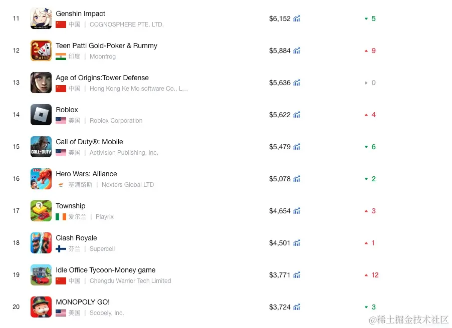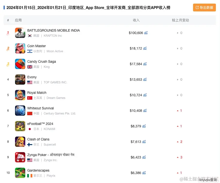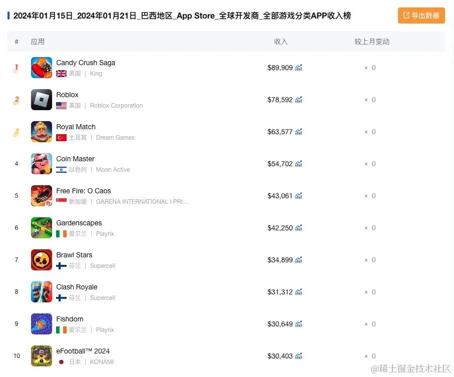 以上就是本周(2024年 1月15日-2024年1月21日)美国、巴西、印度、加拿大等国家的游戏类应用收入榜单,如果您还想了解更多国家或其他类别的应用收入情况,可以后台私信我,免费帮您查询您关心的应用上架相关的数据。