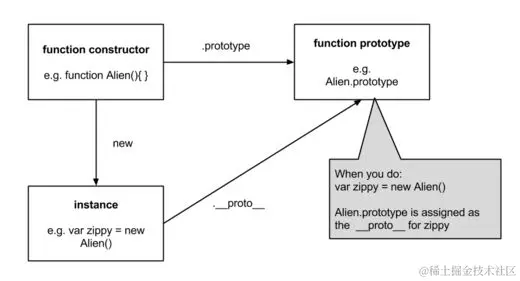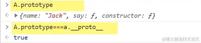 而构造函数A的prototype,也就是对象a的__proto__所指向的地方