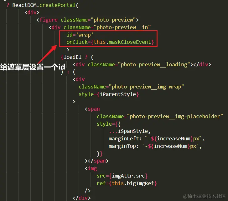 点击预览图,通过 ReactDOM.createPortal 方法生成一个弹窗组件,中间为父容器元素包裹着放大的图片,右上角为工具栏,背后是遮罩层。
