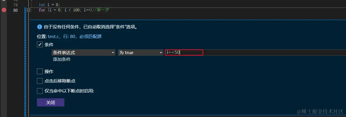 - 如果觉得第一步i==50时有问题,也可以在第一步设置断点,然后右击断点设置条件