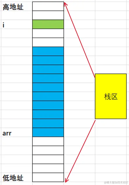 - 栈区内存的使⽤习惯是从⾼地址向低地址使⽤的,所以变量i的地址是较⼤的。arr数组的地址整体是⼩于i的地址。