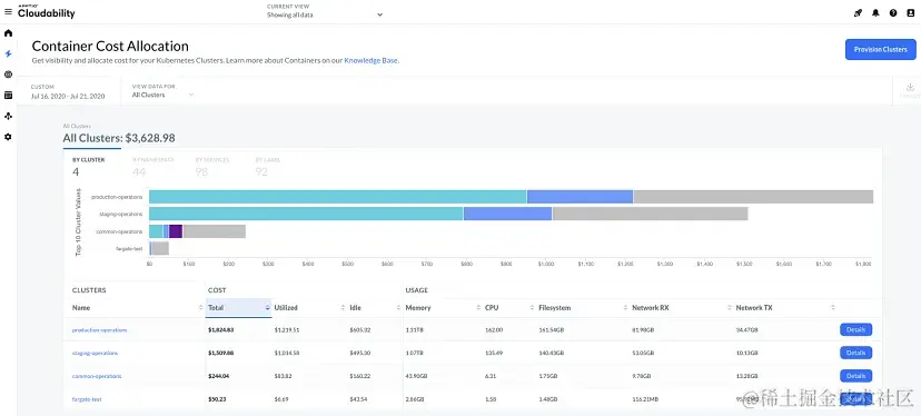 Apptio Cloudability可以自动发现支持每个Kubernetes集群的所有云资源,并将这些信息映射回详细的计费数据。同时为用户提供专门的交互工具,使他们能够在可定义的时间窗口内快速了解每个集群的全部成本和底层资源消耗。
