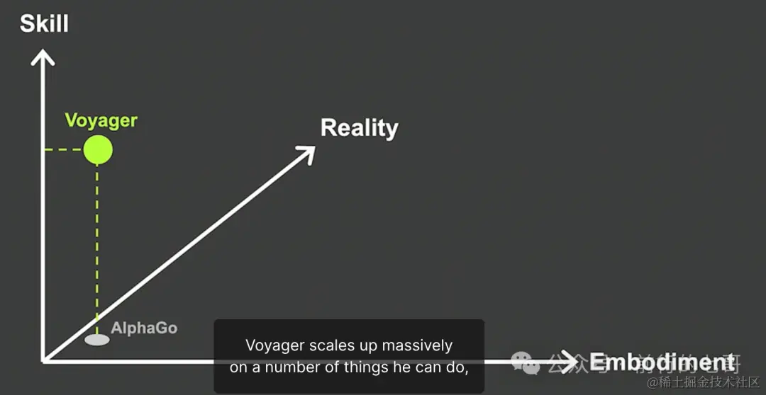 能力轴上他分享了他领导研究的 Voyager,这是一个在《我的世界》游戏中可以大规模扩展多种技能的代理。只需要给Voyager设定一个高层目标“尽可能获得多的独特物品”,然后它就可以自己不断地玩游戏,探索地形,开采各种材料,对抗怪物,制作数百种食谱等等,并解锁不断扩大的技能树。