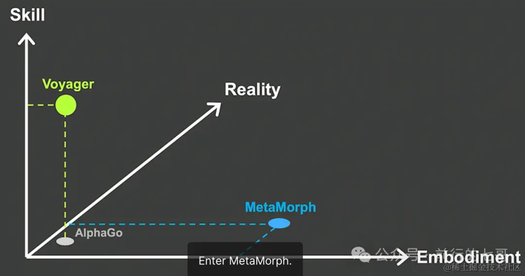 Jim Fan 认为现在针对一般能力的人工智能代理的研究工作主要是围绕着三个轴,分别是:代理可以执行的技能数量(能力),代理可以控制的身体形式或体现(具身化),以及代理可以掌握现实的能力(感受现实和反应)。