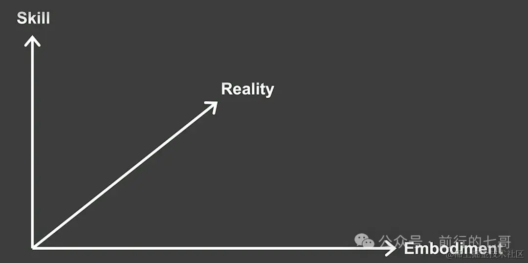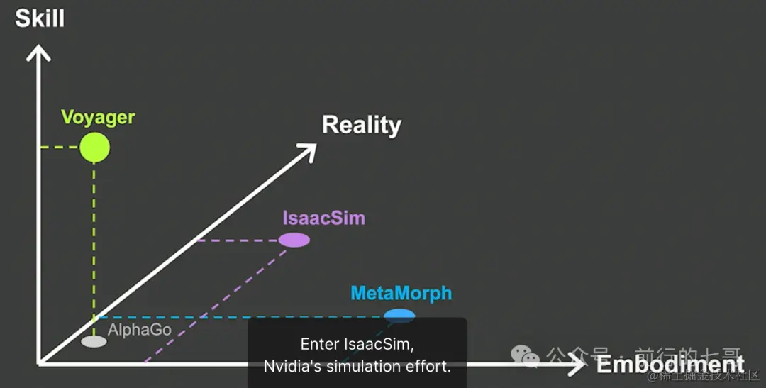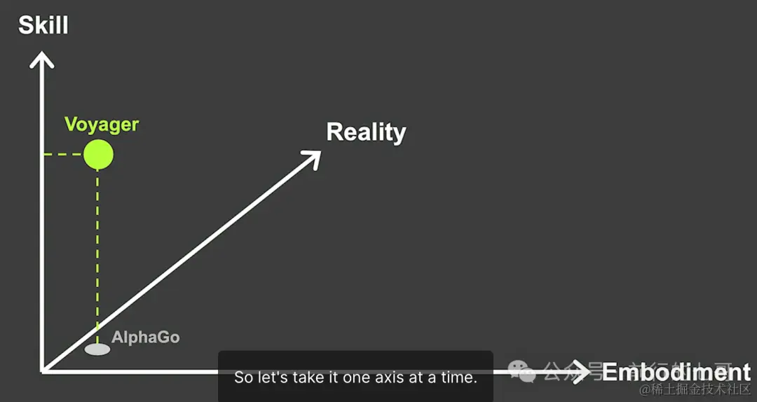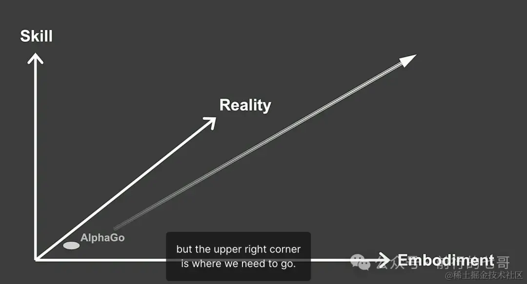 他之前被AlphaGo战胜世界围棋冠军感到震撼,但是后来发现AlphaGo的技能太少了,只会下围棋。他认为人工智能代理的目标是右上方,也就是技能,具身化和现实三个轴同时都有不错的能力的人工智能agent。