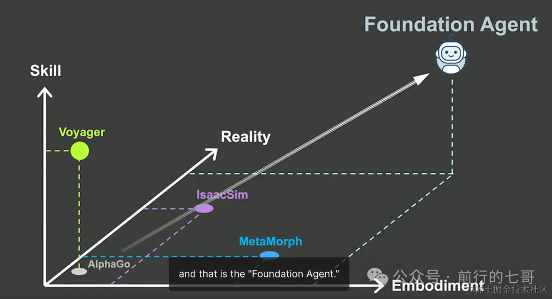 当我们在下图沿着不同的轴往前走的,我们最终会达到右上角,这就是Foundation Agent。这是一个具备三个轴的能力的代理。