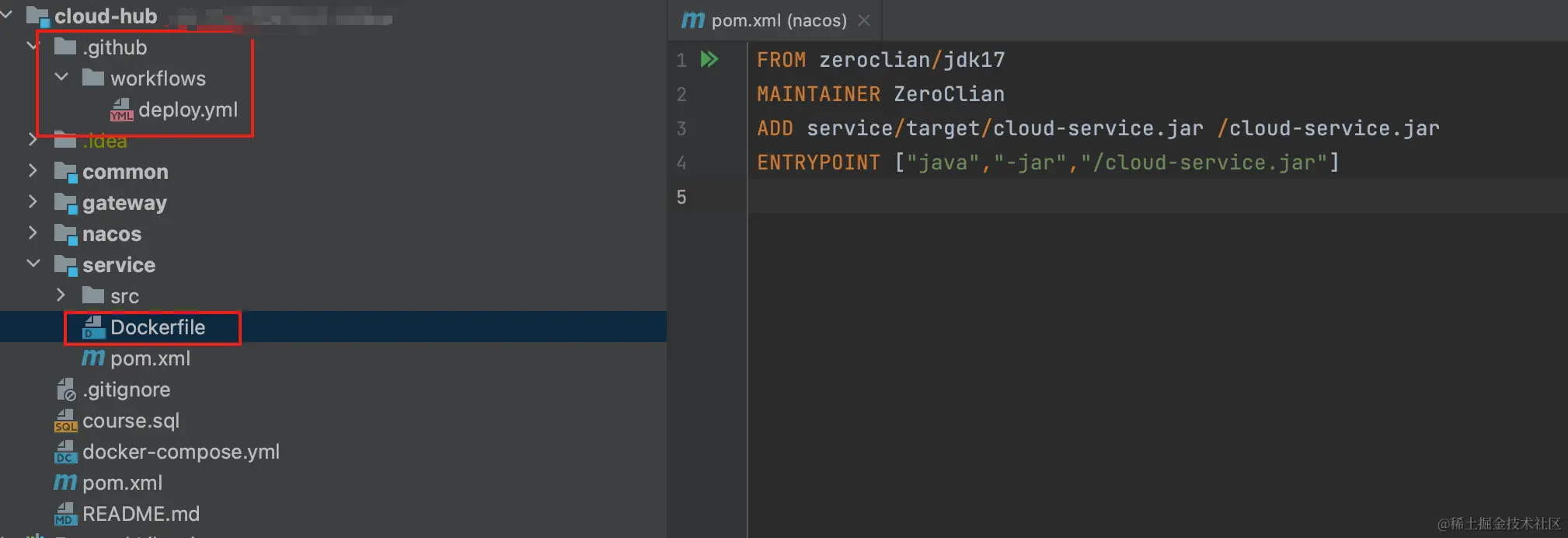 以sevice模块为例子,在项目下创建Dockerfile文件并编辑
