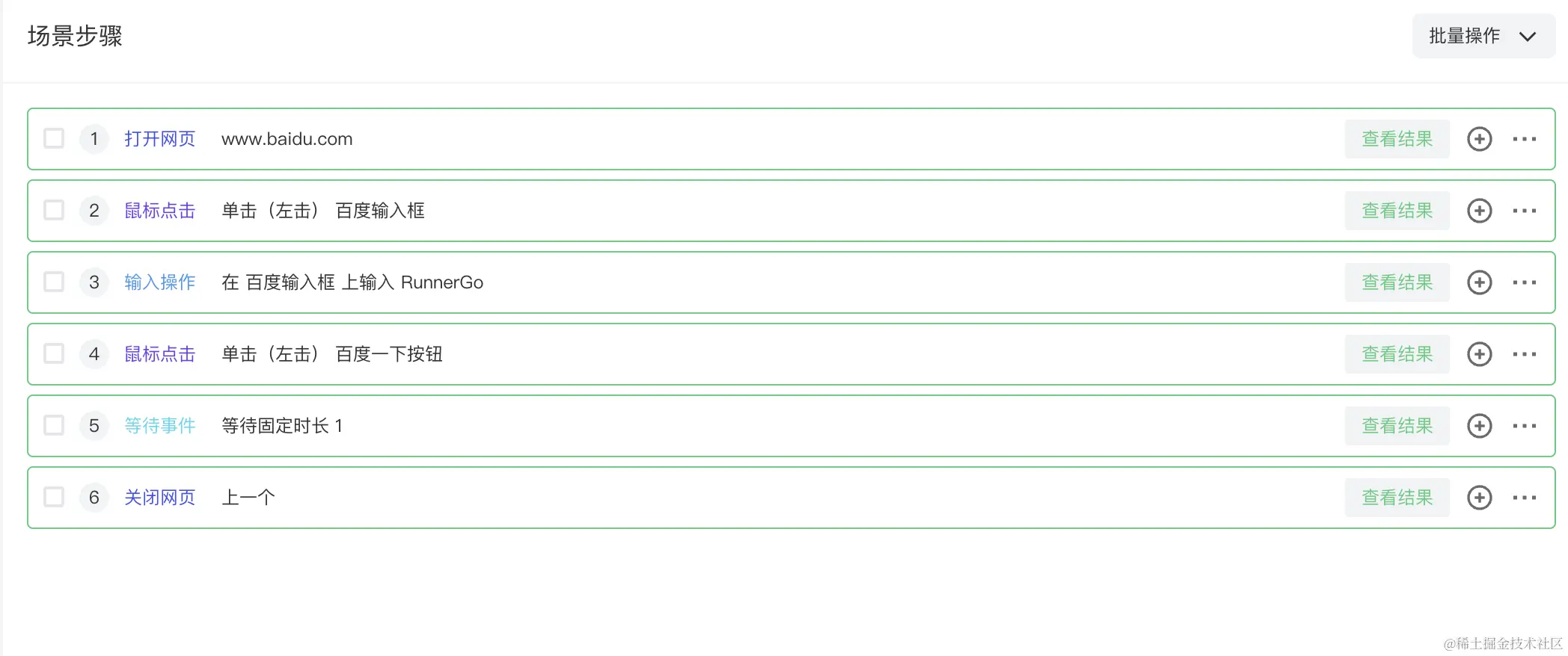 根据以上步骤我们完善测试场景如下图,即可完成我们的一个流程的UI自动化测试。