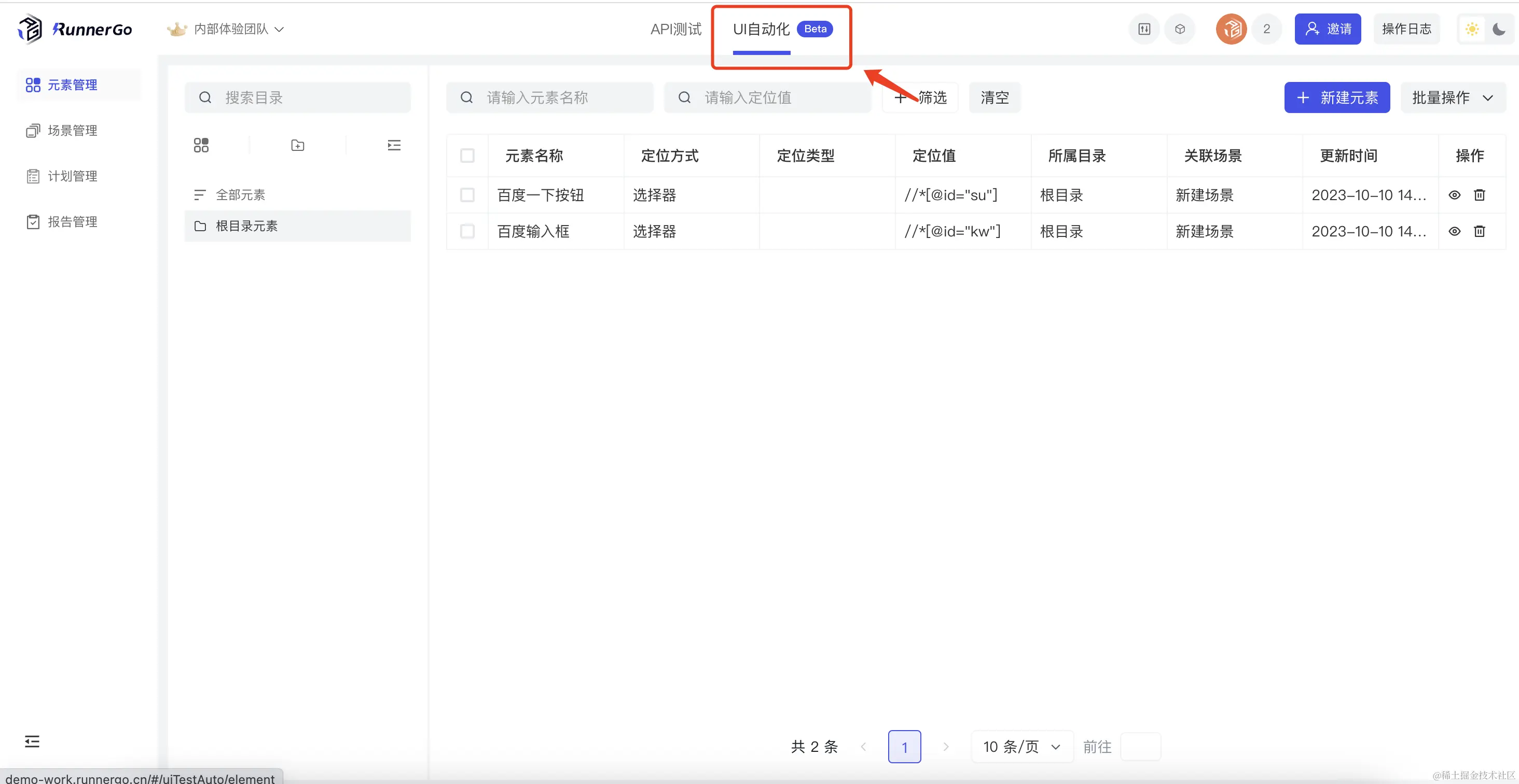 点击体验企业版进入工作台后可以点击页面上方的UI自动化 进入到测试页面