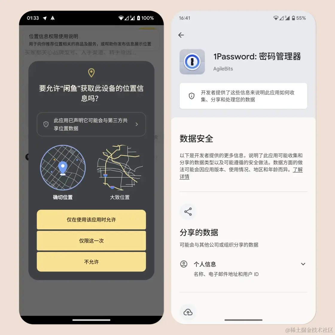 位置信息授权时提供的数据安全提示与 Play 商店中的数据安全提示