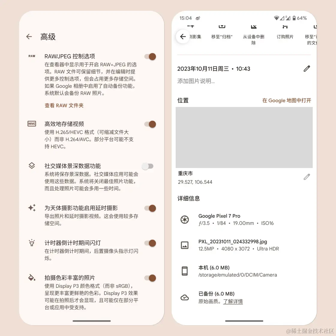 Pixel 新版相机应用中的 Ultra HDR 拍摄选项以及相册中的 Ultra HDR 标识