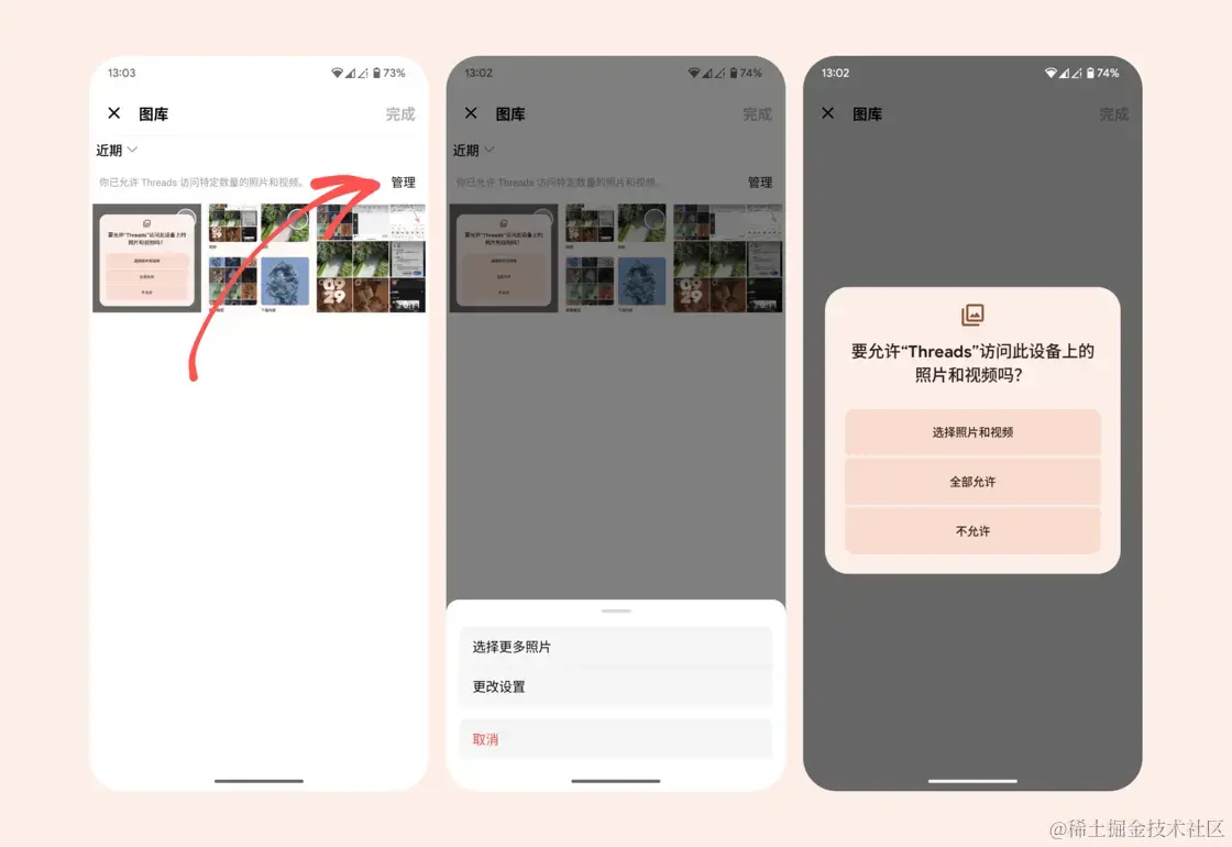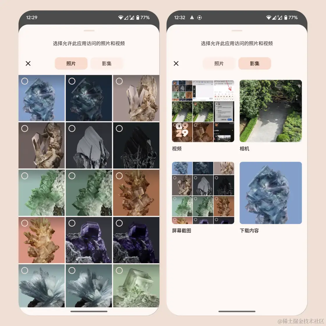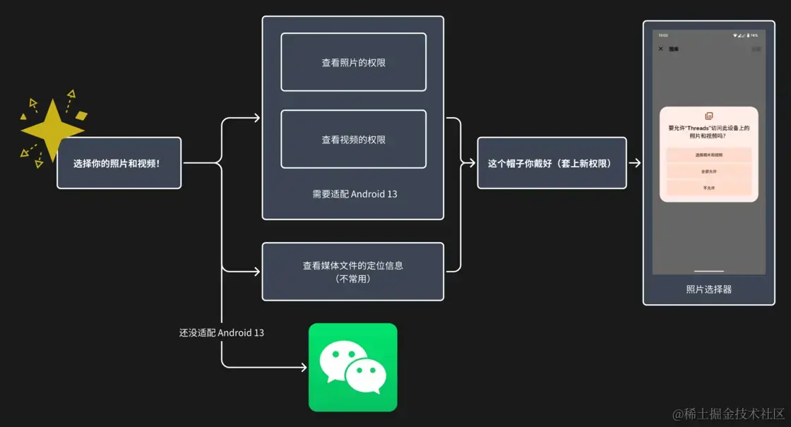 在 Android 13 引入照片选择器这一设计后,Android 14 又新增了类似 iOS 那样的媒体文件范围选取机制,这套机制在 Android 14 中对应的权限是 READ_MEDIA_VISUAL_USER_SELECTED。