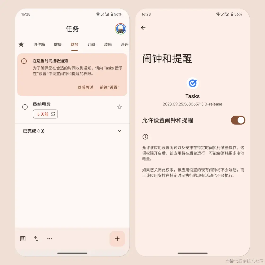 不过问题在于,通过精确闹钟唤醒应用是一种资源消耗极强、Google 也非常不推荐的定时任务规划手段(根据 Google 的开发者文档它可以随时将设备从 Doze 状态中唤醒),此前引入的 闹钟和提醒 权限不再默认授予。这项限制适用于新安装的、面向 Android 13 及以上系统适配的应用。