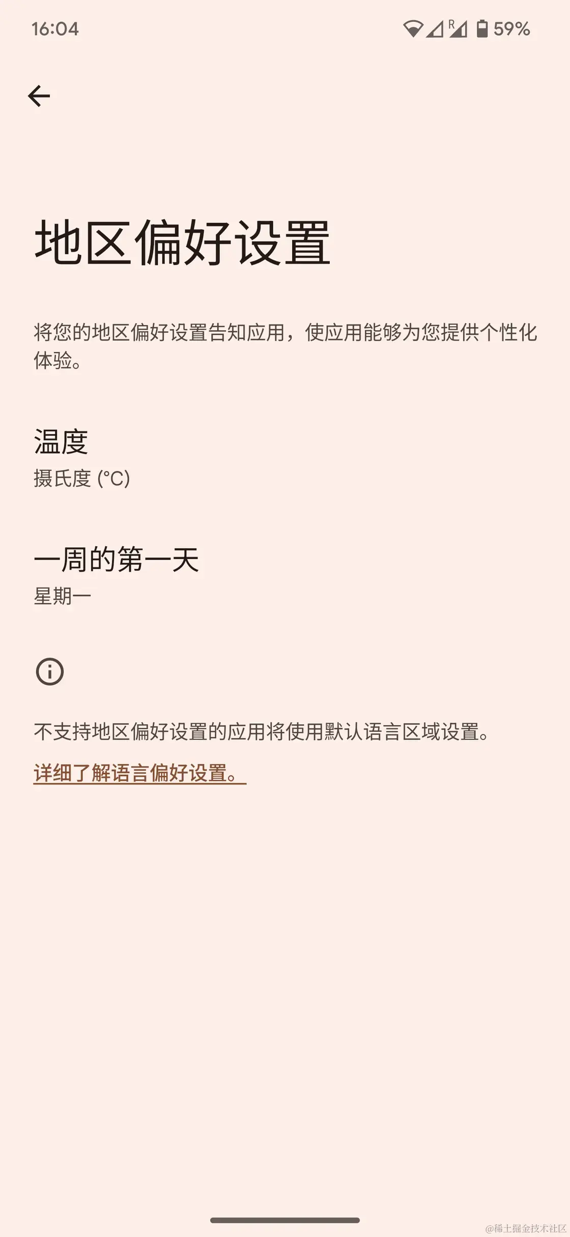 再比如区域偏好设置。我们或多或少都在天气应用、测量工具、量化 app 中接触过与地区偏好相关的设定,从温度、距离、长度采用哪种单位、日期显示采用年月日还是日月年到每周的第一天究竟是周日还是周一……以往这类设置往往都散落在不同应用的设置当中,Android 14 则在「系统 > 语言和输入法」中新增了一项面为「区域偏好设置」的独立页面,一方面方便用户提前选好自己想要的温度单位、每周起始日以及数字呈现方式,另一方面也配套为开发者提供了对应 API 和 Intent 来读取这些偏好设置,然后直接套用到应用当中。