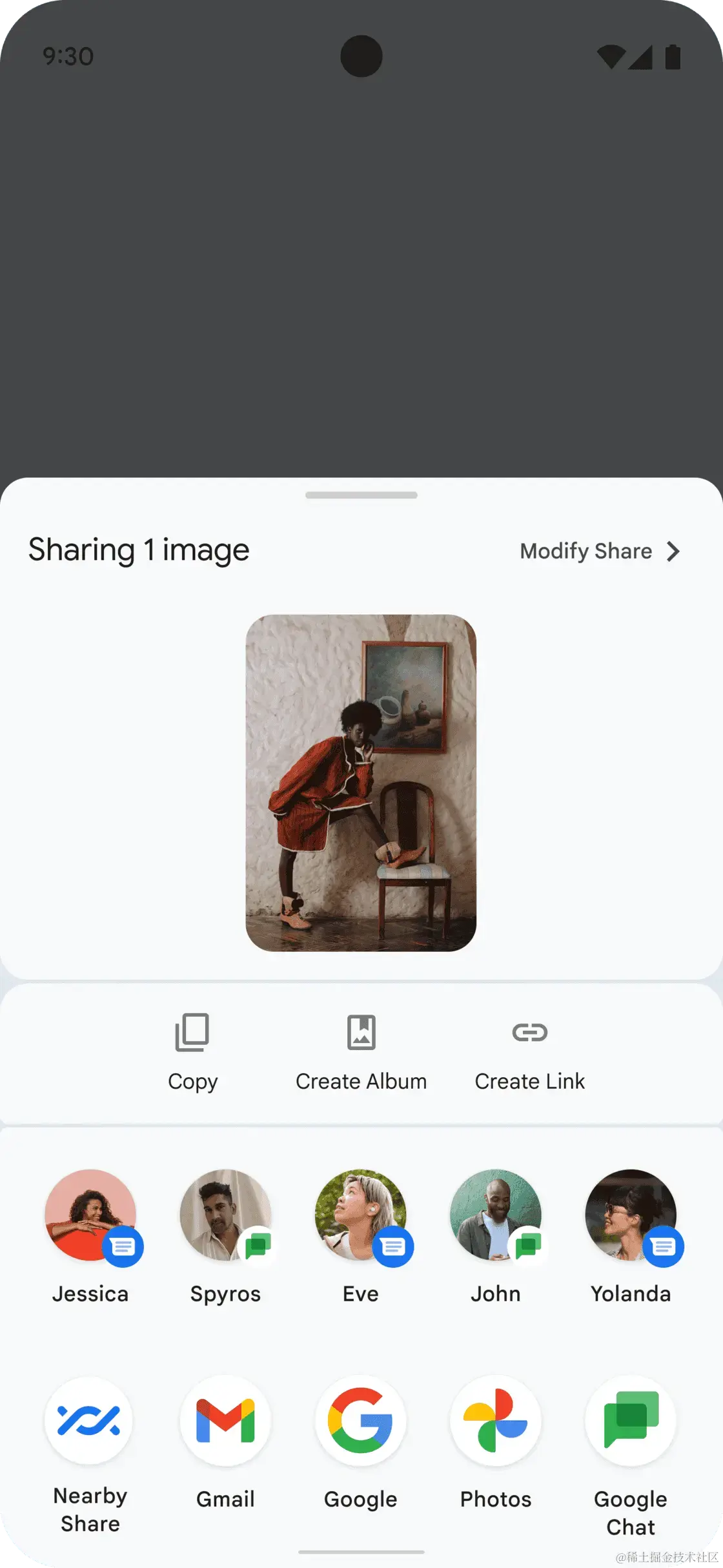 因此在 Android 14 中,Google 基于 Chrome 和 Google 相册的分享菜单设计思路,向应用开放了分享菜单自定义操作定制功能,允许开发者针对特定文件类型声明分享自定义操作,当用户呼出分享菜单时,这些操作选项会出现在分享列表顶部和分享内容预览之间,方便用户快速调用可能需要的应用执行下一步动作;同时 Google 也希望通过调整 Direct Share 目标排序的方式来优化 Android 分享菜单的可用性。
